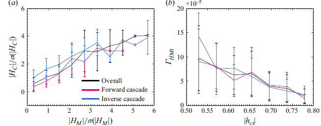 图3 太阳风数据验证。左:Hall效应引发交叉螺旋度;右:交叉螺旋度减弱级串效率。