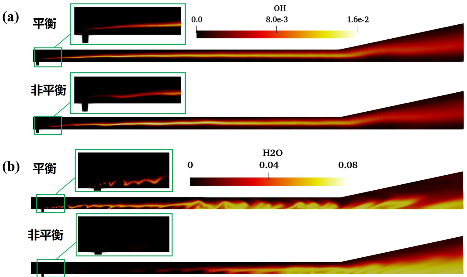 图 1 (a)氢燃料 OH 质量分数云图;(b)乙烯燃料 H2O 质量分数云图