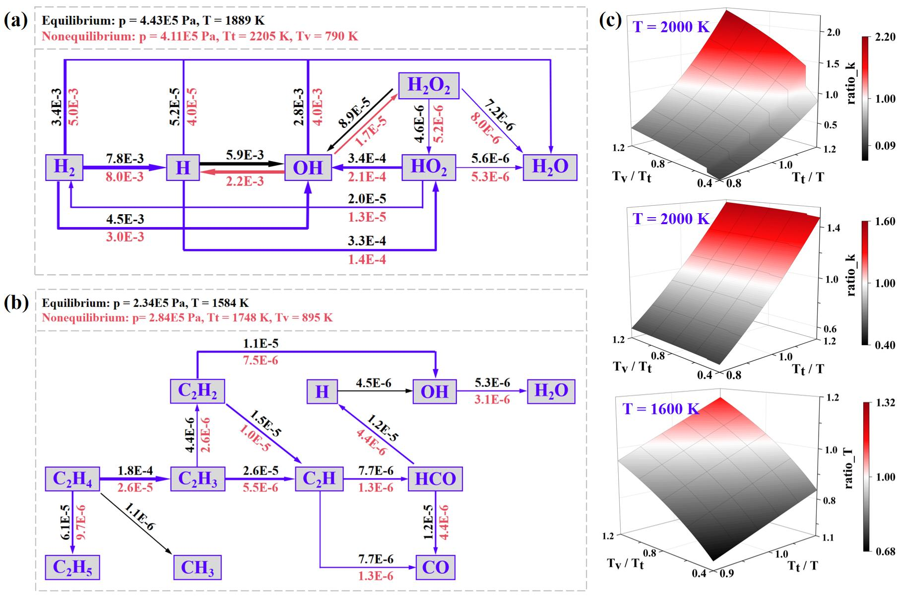 该工作取得突破性进展如下。第一,该研究发展了Dynamic Zone Flamelet Model (DZFM)+ Zonal Nonequilibrium Model(ZNM)超声速湍流燃烧热化学非平衡模型,相较于传统模型,该模型计算效率提升了10倍以上,使得原来需要数年的计算量可在168小时内完成。同时,相较于国内外同行普遍少于1000万网格量,该研究实现了超过亿级网格(2.2亿)的非平衡大规模模拟;第二,该研究详细讨论了氢和碳氢两类发动机热化学非平衡规律。分析了在超燃冲压发动机典型温度区间内不同程度的热化学非平衡效应对于不同类型基元反应的影响。发现对于链式分支反应H+O2=OH+O的抑制和对于脱氢离解反应的抑制分别主导氢燃料和乙烯燃料在非平衡条件下点火滞后,如图1和2所示;第三,相关模拟技术有力支撑了国家某重大专项的型号设计,完成了60余工况的亿级网格高保真计算分析,获得了热化学非平衡条件下燃烧效率更低、推力输出更低的规律,校正了传统基于热化学非平衡假设开展的高马赫发动机设计。