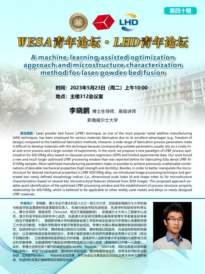 (WESA青年论坛&LHD青年论坛 5月23日 10:00 1号楼312会议室)A machine-learning assisted optimization approach and microstructure characterization method for laser powder bed fusion